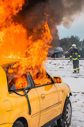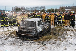 Płonące auto i płachta gaśnicza. Szkolenie strażaków