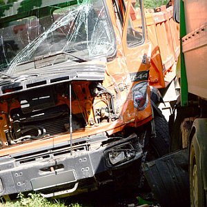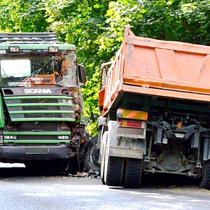Zdarzenie miało miejsce dziś (czwartek, 29 sierpnia) około godziny 15.30 w Gołąbku. Zaprezentowaną tutaj wersję wydarzeń ustaliliśmy na miejscu. Wersję służb ratownicznych znajdziesz w papierowym wydaniu "Tygodnika" (nr 36). Od strony Tucholi jechała zielona scania. W tym samym czasie z drugiej nadjeżdżał pomarańczowy mercedes. Obie ciężarówki z tej samej firmy, obie wypełnione gruzem. Na przepuście nad Stążką akurat jechał rowerzysta. Kiedy scania zaczęła omijać rowerzystę, z górki zjeżdżał mercedes. Kierowca mercedesa nie zdążył wyhamować, odbił w prawo, w stronę barier. Mimo tego nie uniknięto zderzenia. W wypadku nikomu nic się nie stało. Usuwanie skutków zdarzenia trwało dość długo ze względu na zablokowane hamulce ciężarówek. Ruch odbywał się wahadłowo.