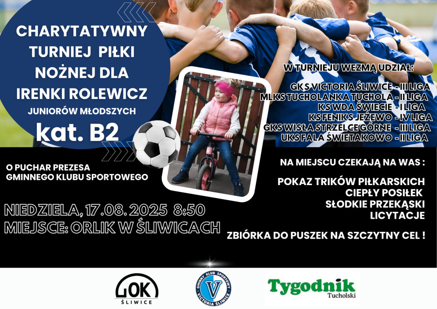 Victoria Śliwice angażuje się w akcję dla Irenki Rolewicz i zbiera mocną obsadę Charytatywnego Turnieju Piłki Nożnej Juniorów Młodszych. Rywalizacja już w najbliższą niedzielę 17 sierpnia na orliku w Śliwicach.