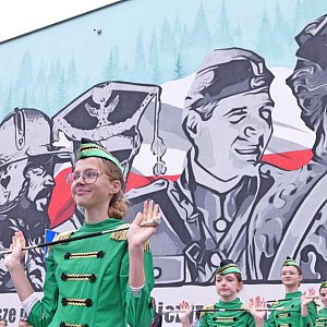 Ubiegłotygodniowe wydarzenie zamieniło się w piknik dla całej szkolnej społeczności, ale zanim to się stało miało oficjalny charakter z udziałem przedstawiciela jednostki Wojska Polskiego z Grudziądza czy imponująco prezentujące się grupy rekonstrukcyjnej na koniach: Koła Przyjaciół 16/2 Pułku Ułanów Wielkopolskich. O przywiązaniu do historii gminy Lubiewo opowiadał nauczyciel Stefan Ochendal przypominając o istnieniu odwiedzanej przez weteranów i ich rodziny kwatery w Klonowie. Przemawiający goście zwracali uwagę, że obecne bardzo niespokojne czasy są najbardziej przemawiającym do ludzkich umysłów pretekstem do tego, aby promować treści patriotyczne. Mural dla szkole podstawowej jest ich zdaniem tego znakomitym przykładem. Dodajmy, że uroczystość w Lubiewie domknął występ Mażoretek Bysławskich. Na tle wielkiego muralu taniec mażoretek nabrał wyjątkowego charakteru.