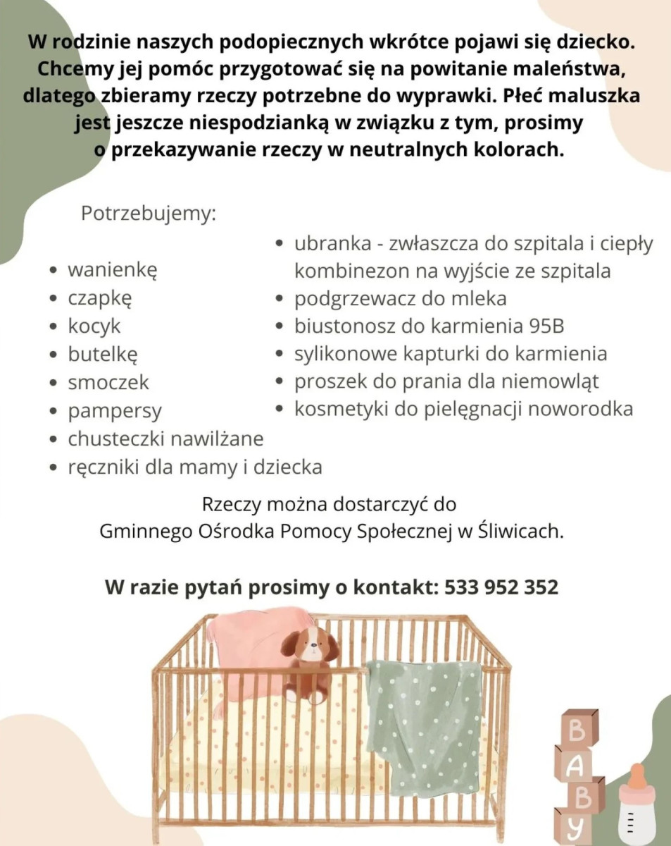 W rodzinie objętej opieką Gminnego Ośrodka Pomocy Społecznej w Śliwicach niebawem pojawi się dziecko, jednak ze względu na trudną sytuację życiową, ta potrzebuje wsparcia.