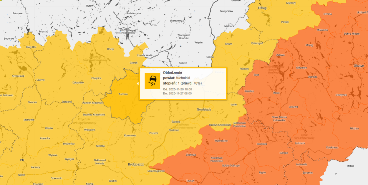 Przez Centralne Biuro Prognoz Meteorologicznych w Warszawie, zostało wydane ostrzeżenie meteorologiczne dla powiatów naszego województw, w tym powiatu tucholskiego i Tucholi. Środowego wieczora może zacząć robić się ślisko. Warto o tym pamiętać wybierając się w podróż samochodem.