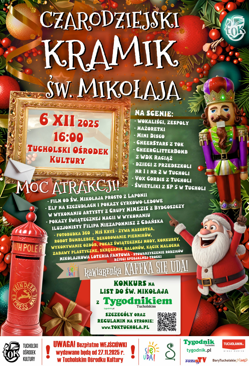 Pełny, bardzo bogaty program zbliżającego się Czarodziejskiego Kramiku Św. Mikołaja znajdziecie poniżej na plakacie. Atrakcji w Tucholskim Ośrodku Kultury będzie bez liku. Należy pamiętać, że na wydarzenie obowiązują BEZPŁATNE WEJŚCIÓWKI. Będzie można odbierać je w TOK-u od 27 listopada. W imieniu organizatorów zachęcamy, aby pośpieszyć się, bo wejściówki rozchodzą się zawsze bardzo szybko. Taka zasada wprowadzona jest przez Tucholski Ośrodek Kultury ze względów logistycznych. TOK, mimo że przestronny, zawsze jest oblegany przez dzieci i ich rodziców podczas Mikołajek. Stąd wejściówki, aby zapewnić komfort zabawy uczestnikom.