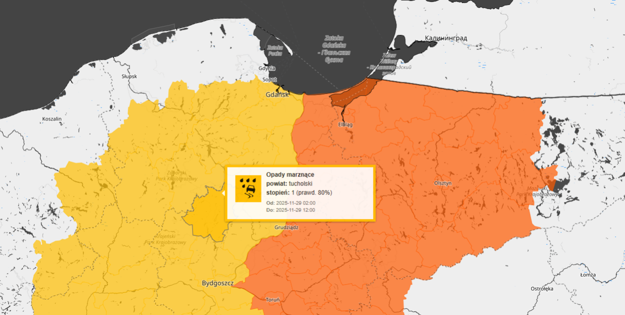 Przez Centralne Biuro Prognoz Meteorologicznych w Warszawie, zostało wydane ostrzeżenie meteorologiczne dla powiatów naszego województwa. Na liście jest Tuchola i powiat tucholski. Będzie padać marznący deszcz.