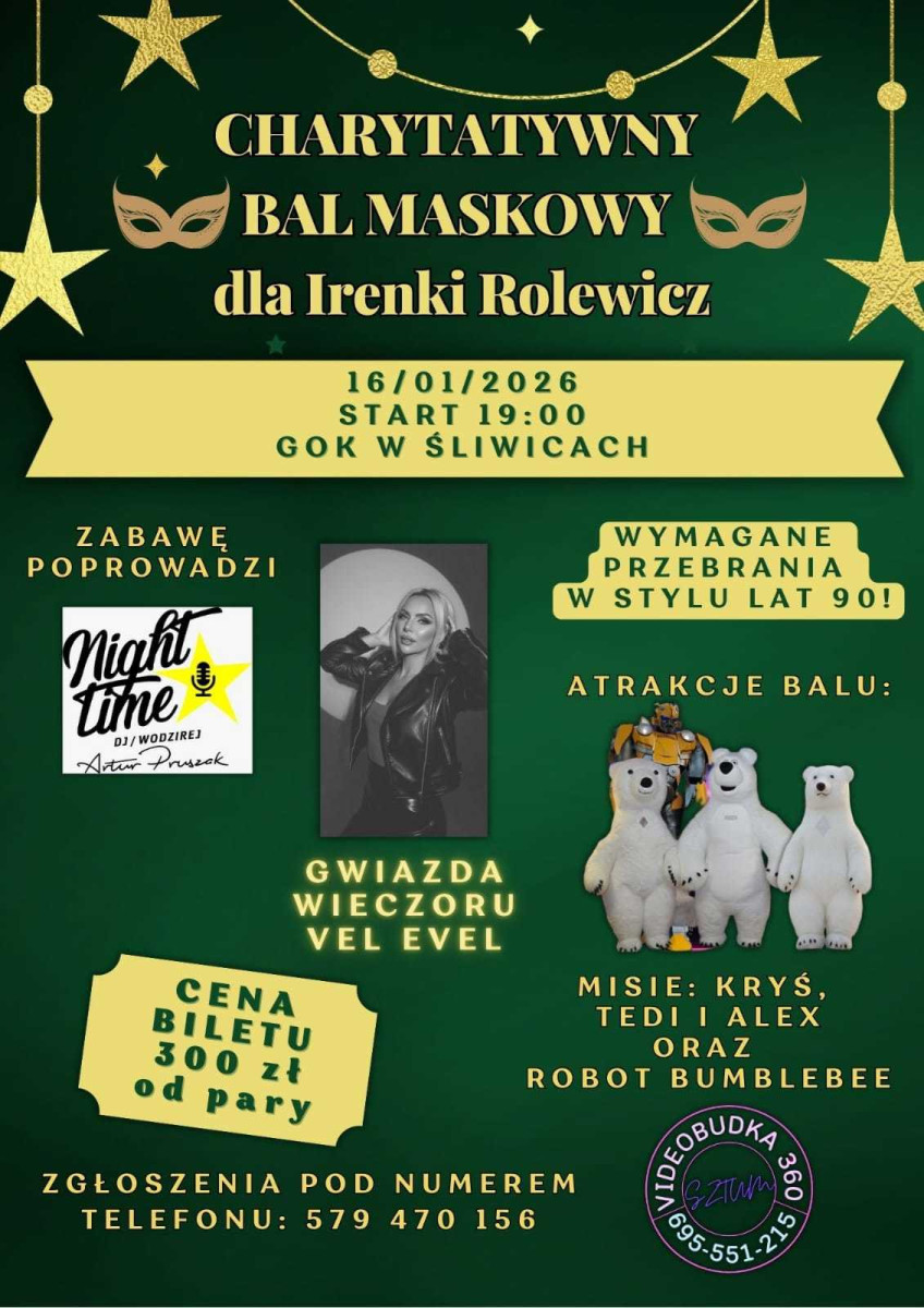 16 stycznia w Gminnym Ośrodku Kultury w Śliwicach odbędzie się Charytatywny Bal Maskowy dla Irenki. Zabawę, na której obowiązywać będą stroje w stylu lat 90, XX wieku, poprowadzi DJ/Wodzirej Artur Pruszak. Gwiazdą wieczoru będzie Vel Evel. W programie balu zaplanowano także: wideobudka 360 i atrakcje z udziałem: misiów Kryś, Tedi, Alex oraz robota Bumblebee. Cena biletu na bal, który rozpocznie się o godzinie 19:00, to 300 złotych od pary.