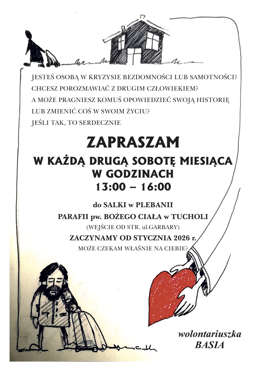 Punkt znajduje się w salce plebani parafii pw. Bożego Ciała w Tucholi, oddzielne wejście jest od ulicy Garbary. Na drzwiach wisi plakat informacyjny. Punkt będzie czynny w każdą drugą sobotę miesiąca. Pierwszy dyżur 10 stycznia 2026 roku w godzinach: 13.00 – 16.00. Zapraszam serdecznie.