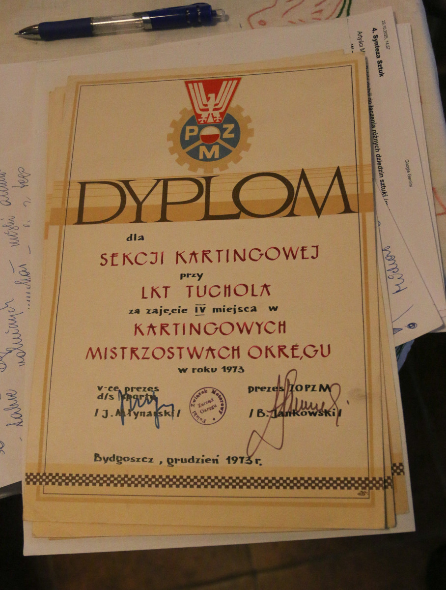 Właściciel uroczego miejsca, gdzie czas się zatrzymał, opowiedział długą historię sekcji motorowej, która przeżywała wzloty i upadki, ale istniała do momentu, w którym umarła naturalną śmiercią, jak określa to rozmówca. On sam był od pokoleń skazany na motoryzacyjny żywot, bo jego dziadkowie jeszcze przed wojną mieli w Tucholi pierwszą taksówkę. Sam Zbigniew Brzuchalski wyrastał w cieniu aut i motocykli, podglądał naprawy, przebywał w warsztatach, później pracował w transporcie. Dziś - obok niestety nieobecnego z ważnych powodów Łodzimierza Józepczuka - nie ma wielu ludzi, którzy tworzyli sekcję, jeździli na zawody, rasowali silniki, byli z motocyklami i gokartami za pan brat. Nieprzypadkowo pojawiły się gokarty, bo takie zawody były ewenementem w życiu Tucholi.