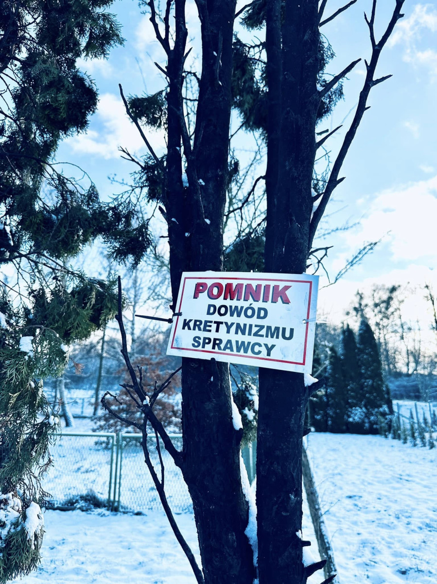 Spalone drzewka zaprezentowaliśmy w naszych mediach społecznościowych, co spotkało się z szerokim oburzeniem Tucholan. Jeden z mieszkańców pofatygował się nawet, aby stworzyć... tabliczkę i powiesić ją na jednej tui. Ma treść "POMNIK – DOWÓD KRETYNIZMU SPRAWCY". Mieszkańcy miasta i okolicy nie przebierają w słowach.