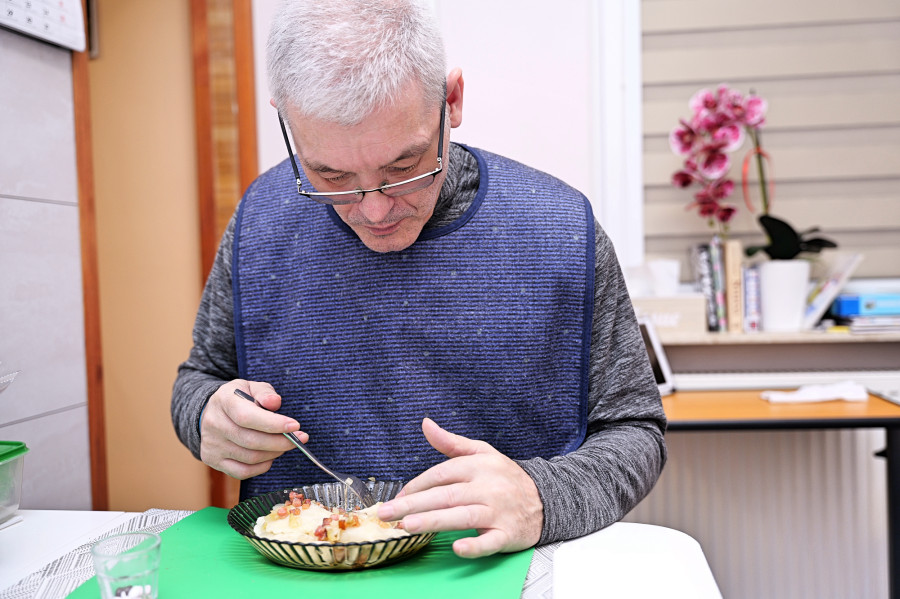 Pan Darek jest w stanie samodzielnie trzymać widelec i zjeść posiłek. To ogromny postęp. Problem jest jednak w tym, że sam nie sygnalizuje żadnych potrzeb.
