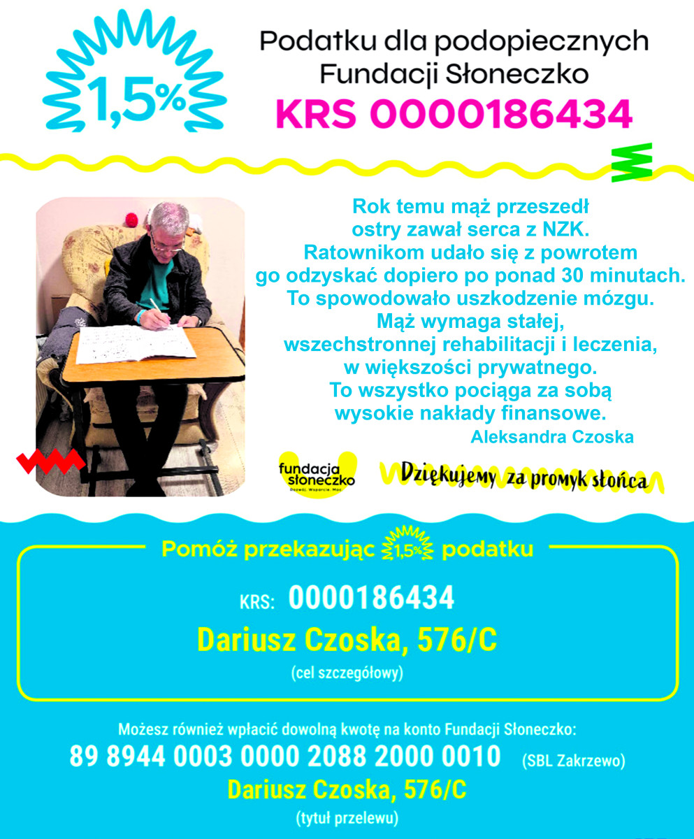 Dariusz Czoska jest pod opieką Fundacji Słoneczko. Udostępnia ona numer konta do wsparcia rehabilitacji i daje możliwość przekazania półtora procenta podatku. Ola Czoska kilkukrotnie podczas rozmowy z nami dziękuje wszystkim za każde, najdrobniejsze wsparcie.