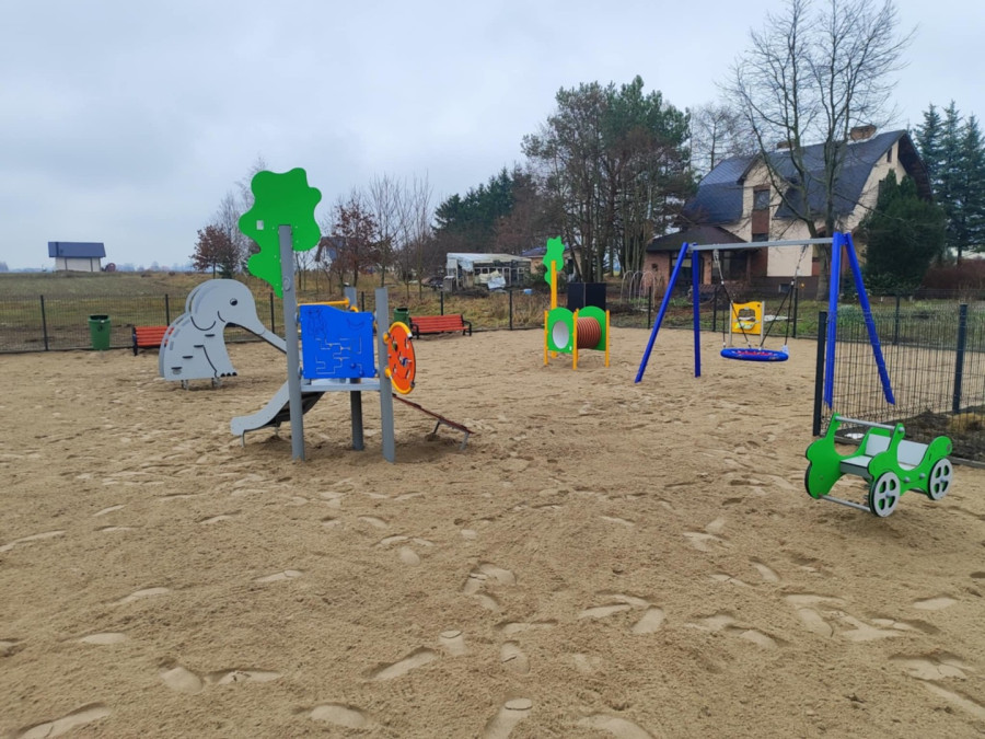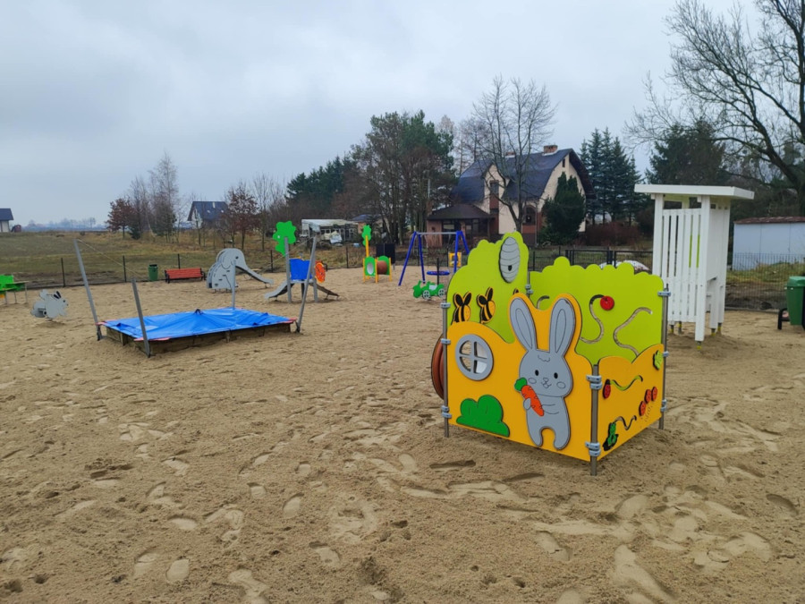Oprócz akcesoriów, z których korzystać będą dzieci, plac zabaw wzbogacono o tablicę informacyjną – regulamin, ławki, kosz na śmieci i ogrodzenie. Wykonano także nawierzchnię bezpieczną z piasku oraz mat przerostowych i dostarczono: chusty animacyjne, zabawki do piasku, piłki sensoryczne, krążki/dyski sensoryczne, domek dla dzieci.