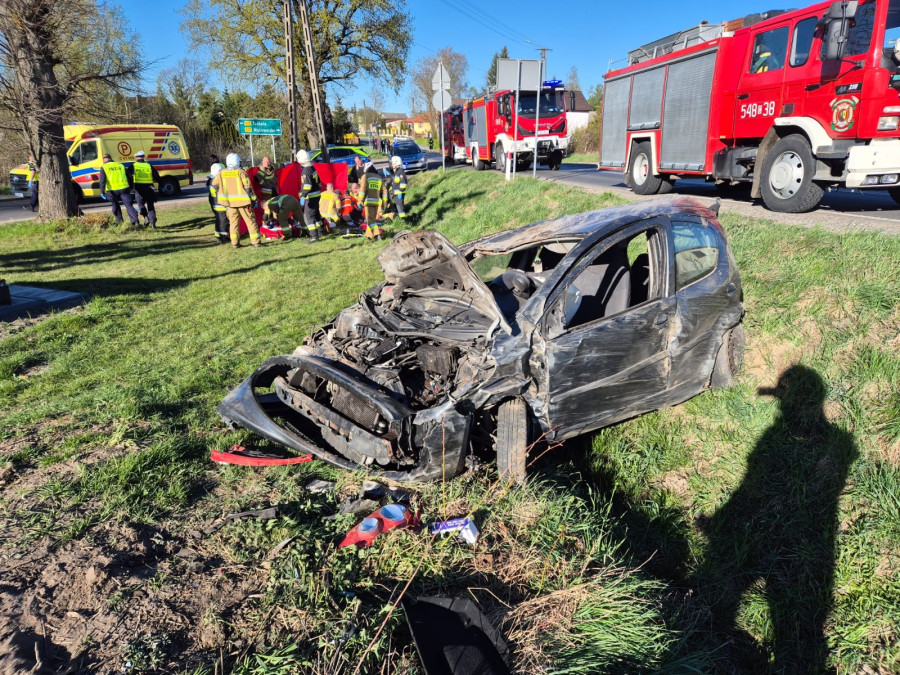Tragiczny wypadek w Pruszczu. Kierująca samochodem wypadła z drogi. W stanie krytycznym została zabrana do szpitala. Pasażer mimo długiej akcji ratowniczej zmarł. Fot. KP PSP Tuchola