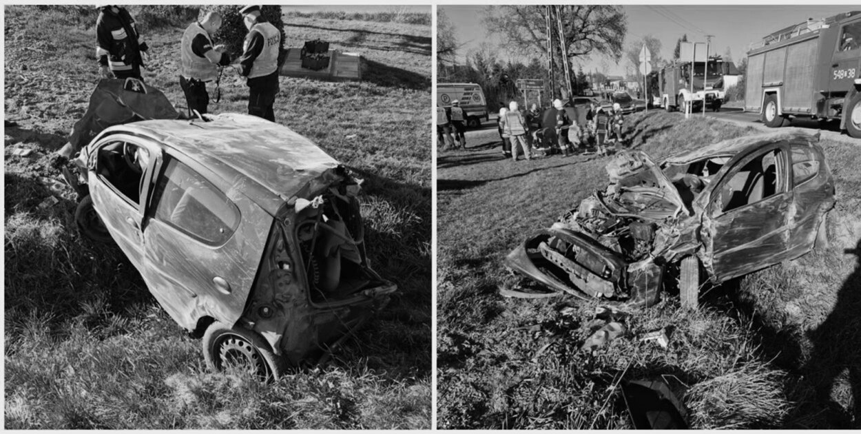 Ok godz. 17:00 z niewiadomych na tę chwile przyczyn samochód prowadzony przez 25-letnią kobietę wypadł z drogi i kompletnie się rozbił. Kobieta wiozła 36-letniego pasażera. W wyniku wypadku oboje wypadli z samochodu i znaleźli się w sporej odległości od niego na poboczu drogi. Mieli bardzo poważne obrażenia, byli nieprzytomni. Tak relacjonuje nam oficer prasowy Komendy Powiatowej Państwowej Straży Pożarnej Grzegorz Polok.