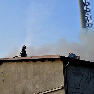 Pożar trawi murowany budynek. Znajdują się w nim kotłownia i magazyn trocin. Pali się ta druga część. Panuje wysoka temperatura, jest duże zadymienie. Strażacy podają 6 prądów wody. Miejsce akcji zabezpiecza karetka pogotowia.