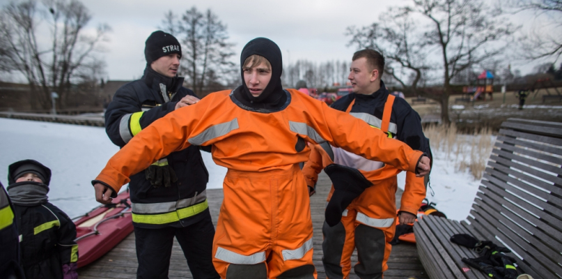 Sprzęt, który chwilę wcześniej leżał na pomoście, ruszył do akcji. Strażacy stali w pełnej gotowości, tylko... lód nie chciał współpracować. Przygotowany dwa dni wcześniej przerębel zamarzł na amen. Pozorant dwoił się i troił, by wpaść do wody, jednak twarda materia nie dawała za wygraną. W ruch poszły piły i wreszcie ćwiczenia rozpoczęły się na dobre. Kajetan Cynarzewski znalazł się w wodzie jako poszkodowany. Jako pierwszy w rolę ratownika wcielił się instruktor.