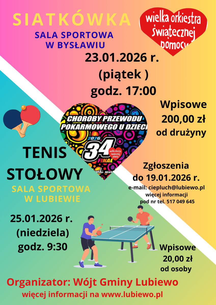 Wielkimi krokami zbliża się 34. Finał Wielkiej Orkiestry Świątecznej Pomocy, a wraz z nim liczne okazje, aby wspomóc akcję i jej cel. Gmina Lubiewo zaprasza na zawody sportowe w piłce siatkowej oraz tenisie stołowym.