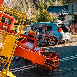 Do źle wyglądającego zderzenia samochodu osobowego i samochodu ciężarowego typu dźwig doszło w czwartek (9 kwietnia) około godziny 8:00 na skrzyżowaniu w kierunku Zalesia i Cekcyna. Fot. Arkadiusz Lorbiecki