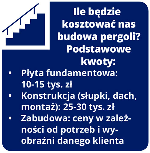 Teren pod pergolę najczęściej jest utwardzony. Zadbać o posadzkę – będącą wymiarów odpowiednich dla zaplanowanej pergoli – powinien sam właściciel nieruchomości. Firma Dereszyńskiego doradza i daje wytyczne do wykonania płyty fundamentowej, a jeśli jest taka potrzeba, może polecić odpowiednich fachowców. Nasz rozmówca poleca instalację pergoli z konstrukcji aluminiowej. Podobnie jest w przypadku dachu. Ten sugerowany przez niego jest zbudowany z lameli aluminiowych. A co z estetycznym drewnem, które powinno zawsze stylowo wyglądać?