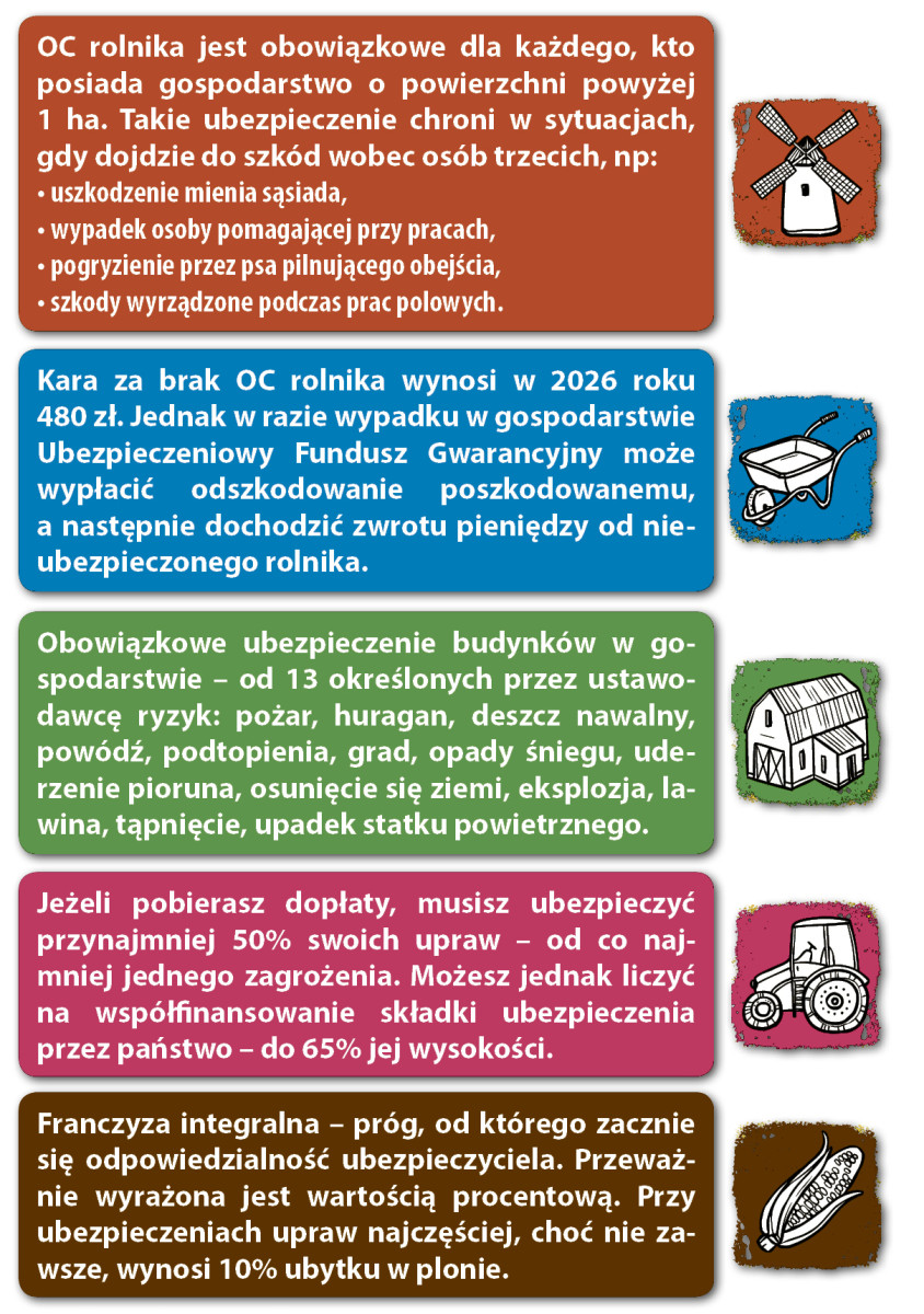 W rolnictwie, któremu zawsze towarzyszy pewien poziom nieprzewidywalności, warto minimalizować ryzyka i zabezpieczać się finansowo. Co ciekawe ubezpieczania w określonym stopniu i tak są w Polsce wymagane. Mowa tu chociażby o OC rolnika, którego wykup jest obowiązkiem ustawowym dla każdego, kto posiada gospodarstwo o powierzchni powyżej 1 ha. Podobnie jest z budynkami gospodarstwa rolnego i minimum połową upraw – jeśli pobiera się dopłaty.